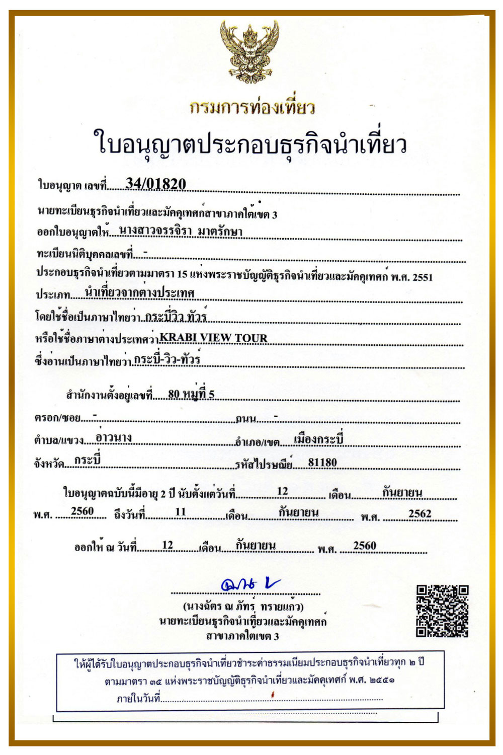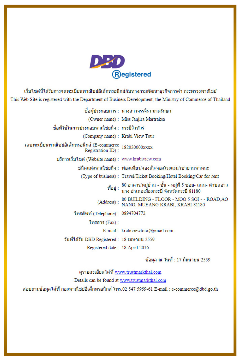 จดทะเบียนถูกต้อง ไว้ใจได้ : เราเป็นผู้ประกอบธุรกิจท่องเที่ยว ที่ได้จดทะเบียนใบอนุญาตธุรกิจนำเที่ยว จาก ททท. สำนักงานทะเบียนและมัคคุเทศก์จังหวัดภาคใต้เขต 3 อย่างถูกต้อง และเชื่อถือได้ เลขที่ใบอนุญาต 34/01820 ในชื่อ กระบี่วิวทัวร์ KRABI VIEW TOUR ประกันอุบัติเหตุคุ้มครอง 100,000 บาท รวมถึง จดทะเบียนพาณิชย์และเว็บไซต์อย่างถูกต้อง